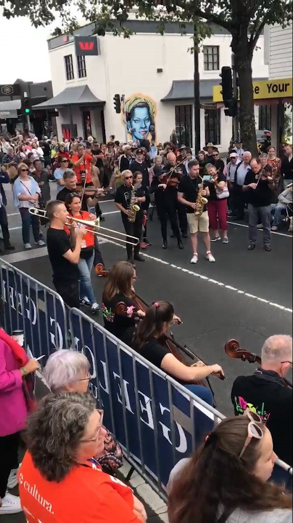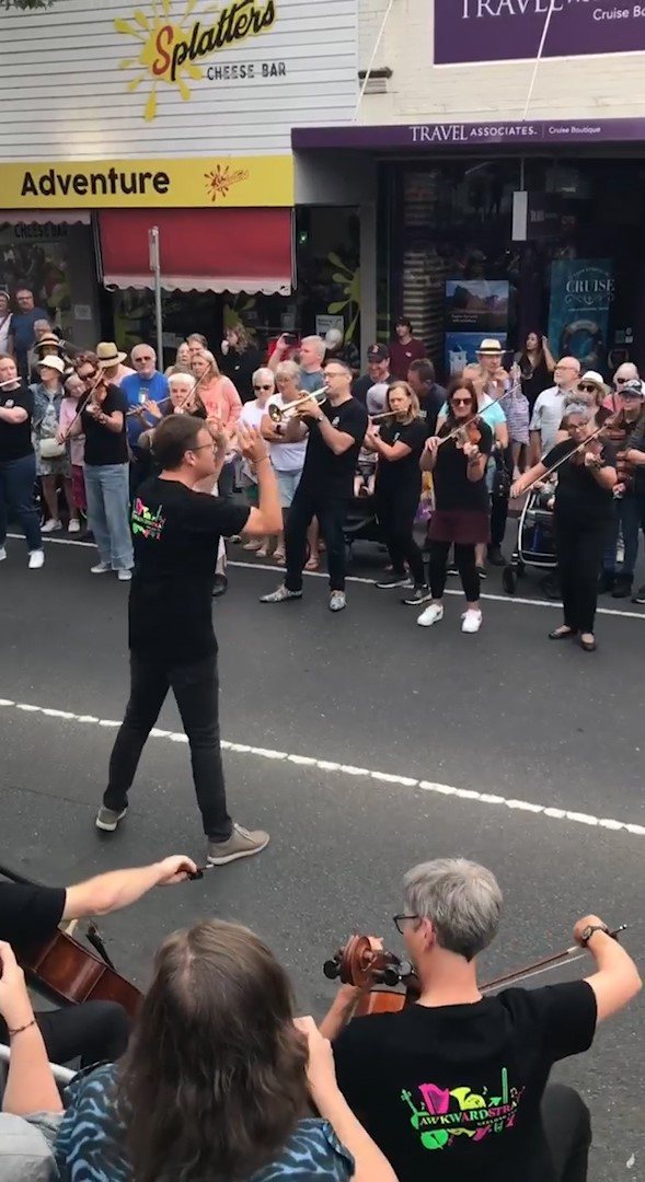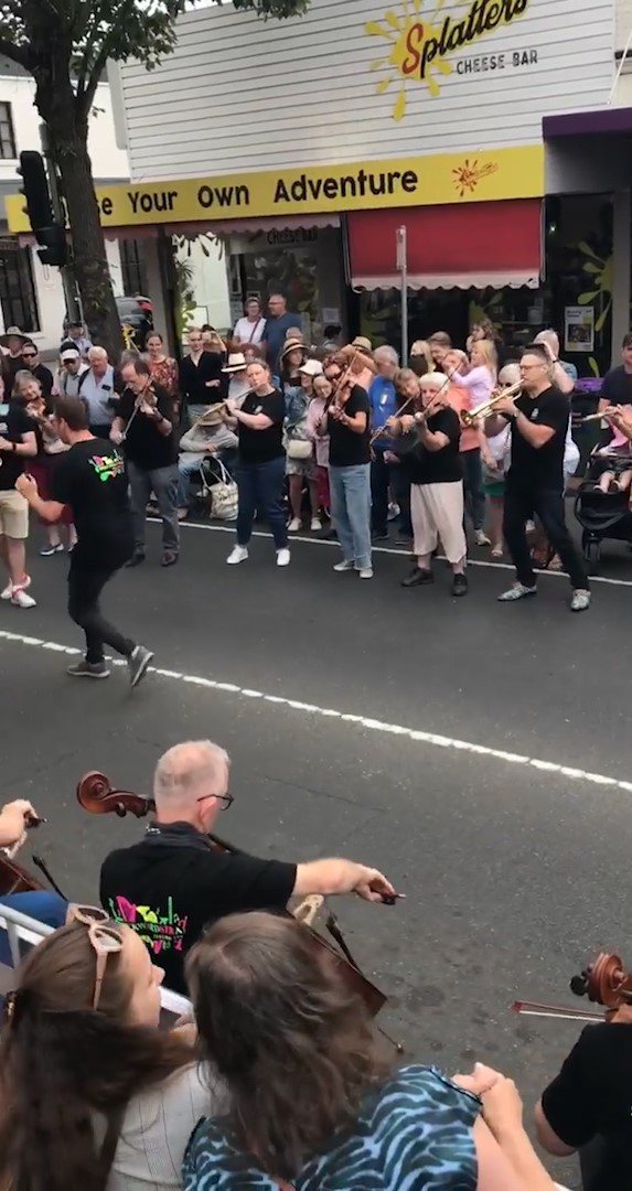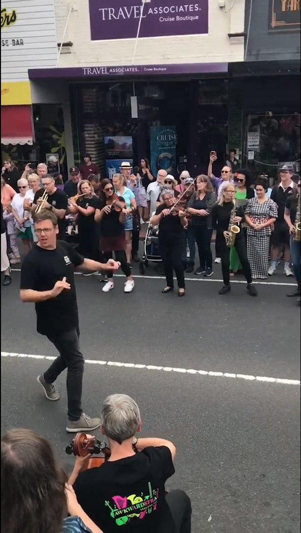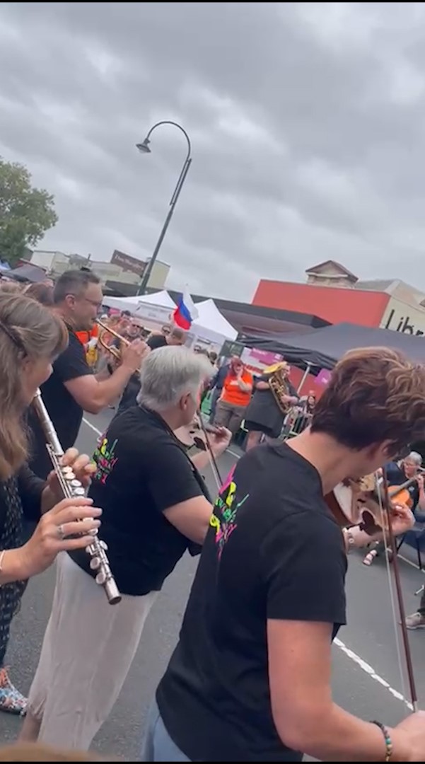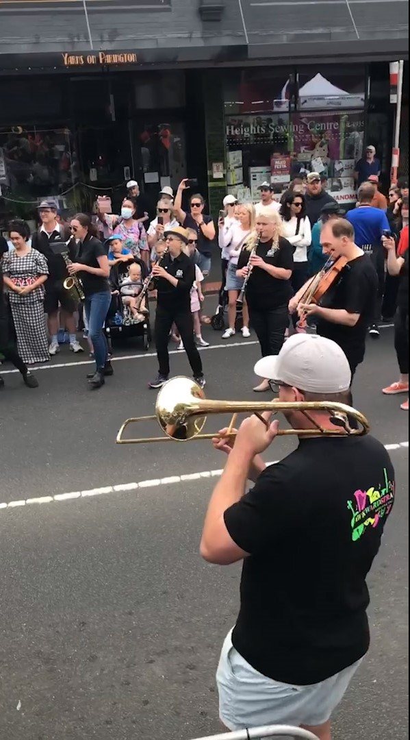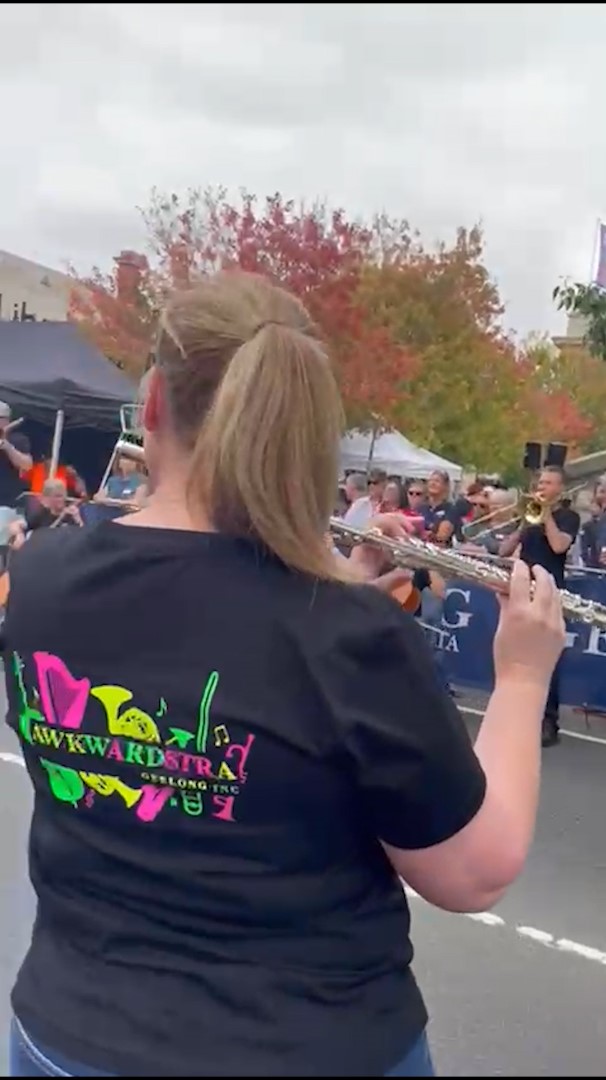 In February 2024, we were asked to open the Pako Festa parade with a flashmob. We played "Respect" by Aretha Franklin in front of the Geelong West Town Hall. Our musicians emerged from the crowd in waves, staggering the start of the song.